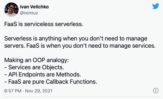 同时,我更喜欢将 FaaS 视为一种具体的设计模式。按照 FaaS 范式,可以部署代码片段(响应某些外部时间执行的函数)。这些函数与事件驱动程序中的回调类似,但是是运行在其他人的的服务器上。由于操作的是函数而不是服务器,顾名思义 FaaS 是无服务器的。