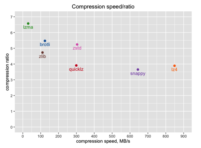 下图是不同压缩算法压缩速度和压缩比的测试数据: