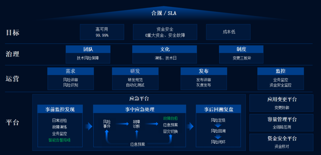蚂蚁的技术风险防控体系从上到下分别代表了三个目标:高可用、资金安全、低成本,三个组织保障:团队、文化、制度,再到需求、研发、发布以及监控的四条防线,最终沉淀出一套完整的技术风险保障体系的平台能力,整个平台由四个能力板块组成,包括了从应急、变更到容量、资金安全。