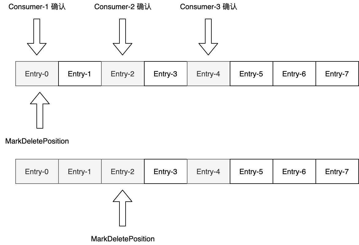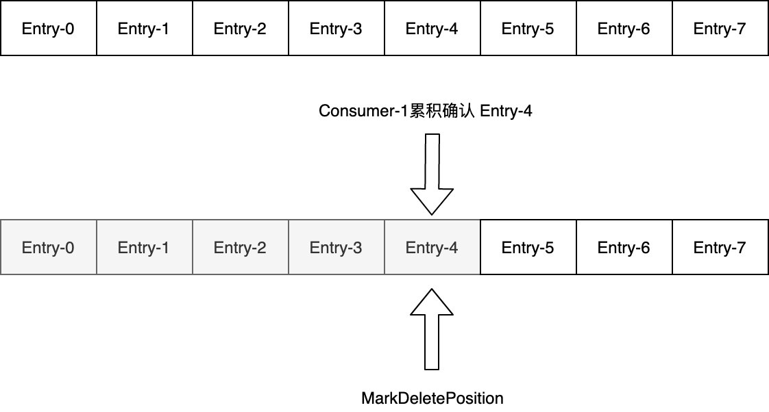 累积消息确认,只需要确认一条消息,游标可以往后移动多个Entry,如:Consumer-1累积确认了Entry-4,则从0开始的Entry都会被确认,如下图所示: