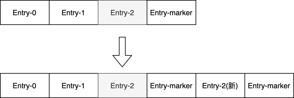 假设Entry-2中存储的空洞信息有修改,则Entry-2会被标记为脏数据,下次存储时,只需要存储一个Entry-2,再存储一个Marker即可。只有当整个Ledger写满的情况下,才会触发Marker中所有Entry复制到新Ledger的情况。如下图所示: