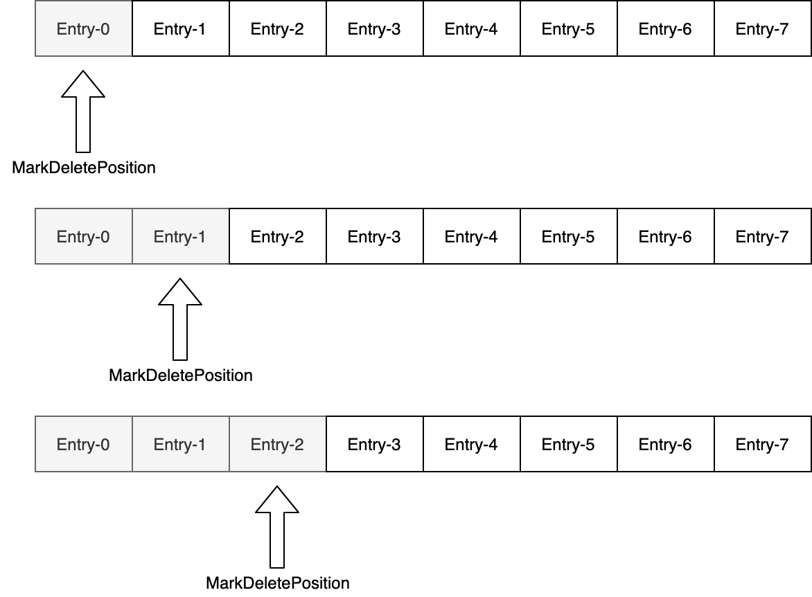 | markDeletePosition | 标记可删除的位置,在这个位置之前的所有Entry都已经被确认了,因此这个位置之前的消息都是可删除状态 |