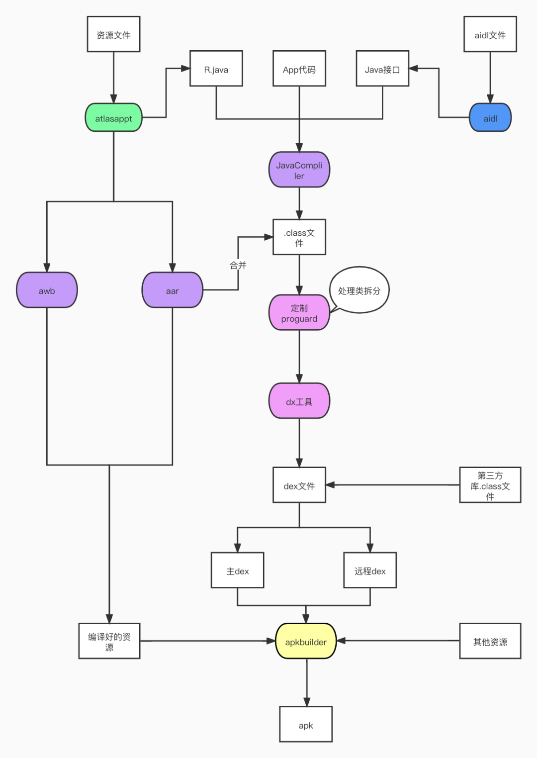 当运行期将Atlas依赖去除后,Atlas的复杂构建流程(如下图所示)也失去了存在意义。随即,优酷启动了构建侧Atlas 去除项目,目标是将Atlas构建插件去除、构建原生化、纯净化、精简化。通过产物原生化、构建任务清理、工具链升级等一系列动作,在完成了构建侧Atlas去除目标的同时,构建性能也有部分提升。