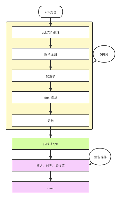 gradle 采用任务情形进行构建任务排布,基于这一拓展特性可以对产物进行后置处理。例如对 apk 后置处理有渠道处理、arsc 处理、对齐、签名、分包处理、图片压缩等任务,每一个任务都需要apk进行反复的解压、压缩、拷贝操作,浪费cpu 、系统io,徒增构建耗时。