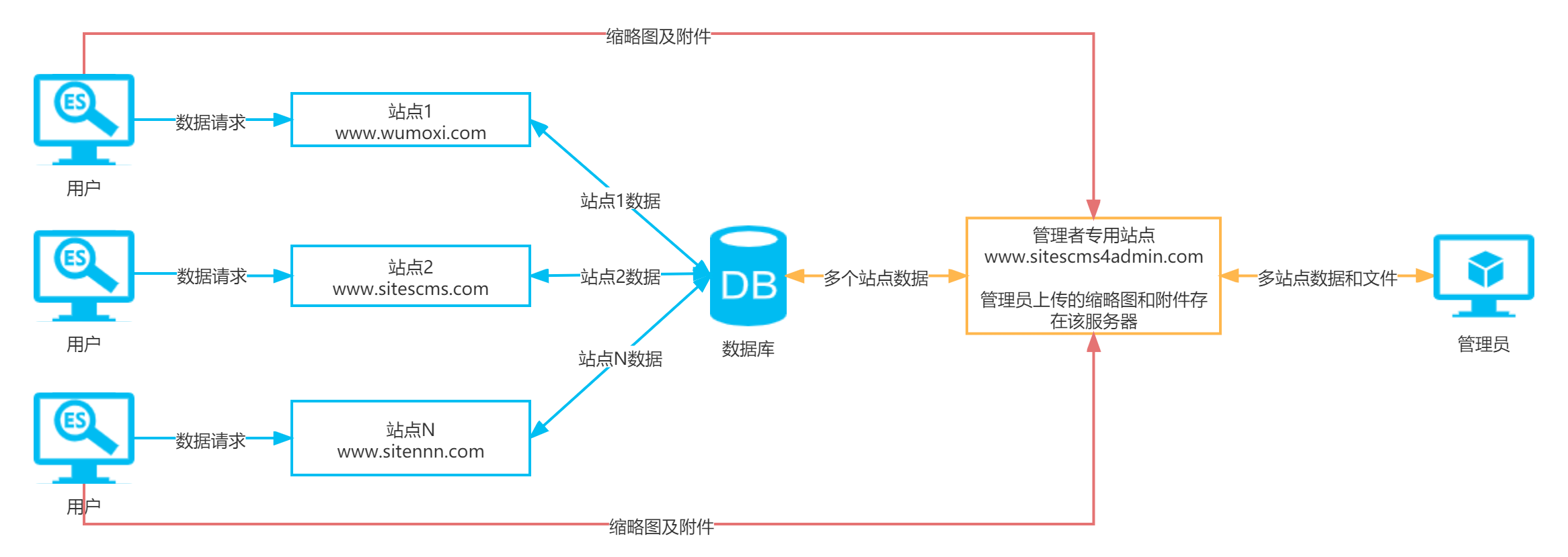 下面通过一个图片介绍sitesCMS多站点内容管理方案,注意其中的附件/图片的处理,这个完全可以使用第三方平台,目前这么做单纯的是因为简便。