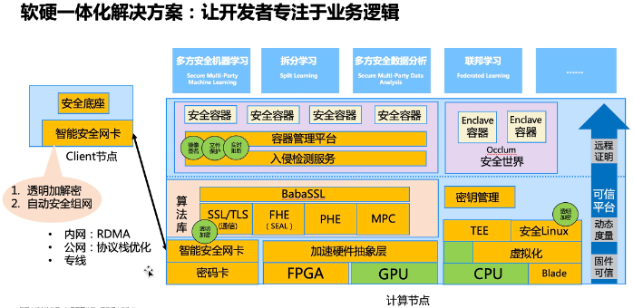 结合上文提到的数据安全与算力加速问题,将各项软硬件工作整合到一起,就形成了一个面向隐私计算的软硬件一体化解决方案,搭配隐私计算软件就可以形成隐私计算一体机。