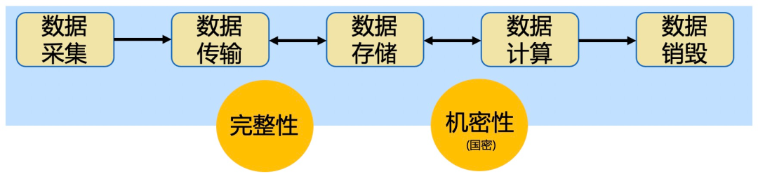 数据从产生到计算再到消亡,会涉及多个环节,其生命周期可能会有数十年之久。在每个环节上都需要有对应的技术体系保障数据安全。数据安全的核心是保障数据的机密性与完整性。当然在数据流转的时代,我们还要能保障数据的所有权,这点暂且不表。数据的机密性是指数据应贯穿全生命周期都应是密态的,只要密钥保护得当,攻击者就无法窃取数据。当然机密性还有一个硬性要求,我们必须运用国密,这又引出了国密的运算加速问题。完整性是指数据不能被篡改,即使被篡改了也要能及时发现。