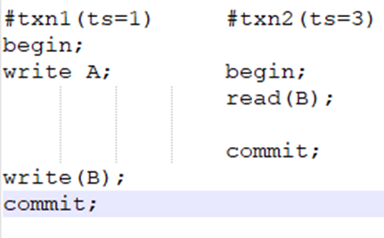 在这个机制之下,当遇到上图的场景时,由于txn1在commit时能把它的readTS refresh到writeTS,所以txn1还是可以提交。但是在标准的时间戳排序协议中,由于txn1 write(B)时发现B的R-Timestamp大于自己的ts,所以事务txn1需要回滚。