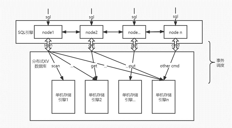 从宏观上看,云溪数据库由两部分组成:上层的SQL引擎和下层的作为一个整体的分布式KV数据库。任何针对于数据库的SQL操作,经过SQL引擎的解析之后,都会把它们分解成一组组的kv操作,比如“select * from t”会被分解成scan操作,”update t set a = 1”会被分解成scan和put(conditionalPut)操作......事务主要是在下层的KV数据库对kv操作进行调度,以完成对更底层的存储引擎的并发读写。