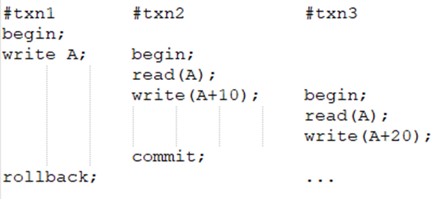 级联回滚问题:txn2依赖txn1,txn3依赖txn2,可能会有txn4依赖txn3……当txn1回滚时,会造成大面积的事务回滚。