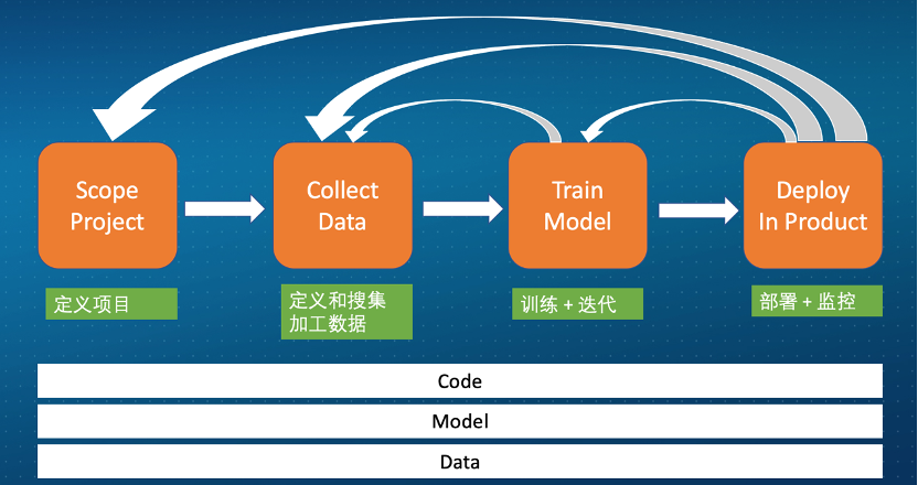 用如下的图可以表示,即机器学习系统从第一步的定义项目,到第二步的特征数据加工,到第三步的模型训练和迭代,到第四步的模型部署和监控,也采用流水线的方式连续进行,其中有若干小循环,例如模型训练不理想,可能需要重新进行数据加工;模型监控下发现线上模型的效果有回退,需要重新训练等。简单来说就是实现Code、Model、Data这三者的CI(Continuous Integration)+ CD(Continuous Deploy)+ CT (Continuous Training)+CM(Continuous Monitoring)。