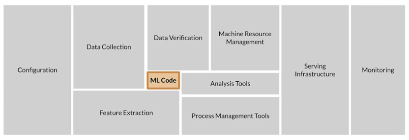为什么? 因为在一个生产环境中运行的机器学习系统,机器学习模型相关的代码只占很小很小的部分,大约5%。