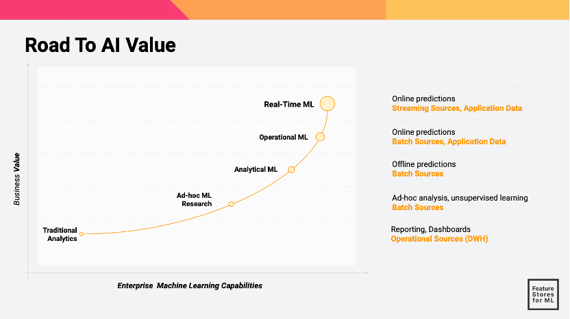 这个图是AI价值分析图,横轴是机器学习系统的技术能力,纵轴是系统的商业价值。从图上可以看出,Real-Time ML(实时的机器学习,即具备流式实时数据接入并进行在线预测能力的机器学习模型,价值最大。可以理解,现实世界中机器学习最产生商业价值的场景莫过于广告系统的CTR预估模型和电商系统的推荐模型,很显然,模型如果能得到用户的最近行为并进行训练,然后针对用户进行推荐,是最能提升预测精准度,并最终体现在商业效果的提升上的。