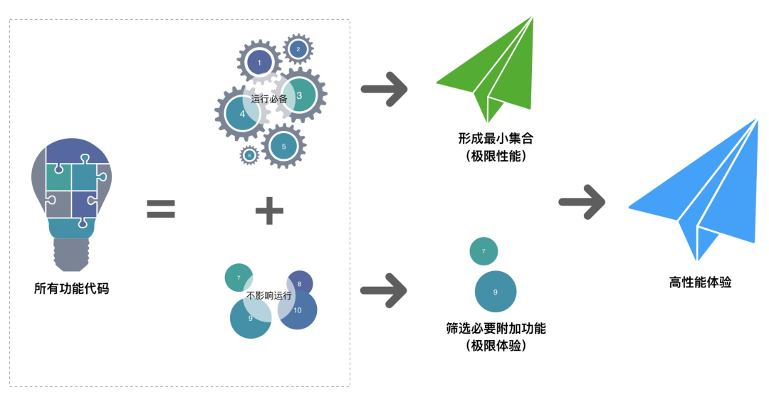 最小集是一个探底的过程,在保证首屏产品形态不变形的情况下做出最小可运行,去掉其他所有跟首屏无关项,这就是减法。我们可以理解这个最小集是在不改变现有架构的情况下,我们最优的优化效果。如果最小集的极限数据达标,接下来就要在此基础上把必要的相关依赖项逐个加回来,保障产品功能完善,其他没必要的依赖性可以优化、或者去掉、或者延后等,这就是加法。当然如果这个最小集的极限数据都不能达标,那我们就需要从其他维度去寻找优化点了,一般能够从网络耗时和架构合理性两个方面找到突破点。
