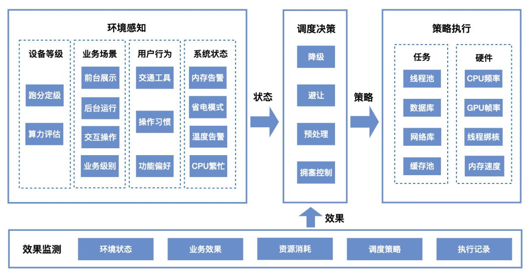 策略执行分为任务执行和硬件调优:其中任务执行,主要是通过内存缓存、数据库、线程池和网络库对相应任务的进行运行控制,来间接实现对各类资源的调度控制;而硬件调优,则是通过与系统厂商合作,直接对硬件资源进行控制;如CPU密集的高优业务开始运行时,将提高CPU频率,并将其运行线程绑定到大核上,避免线程来回切换损耗性能,最大化地调度系统资源来提升性能