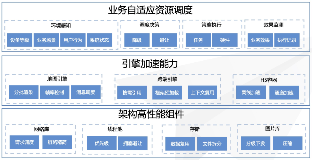 性能优化是一个体系化问题,我们在优化方案上分为三层,业务、引擎和基础能力,分别自上而下明确优化点。上层业务进行自适应资源调度,中间引擎提供加速能力,底层能力提供高性能组件。