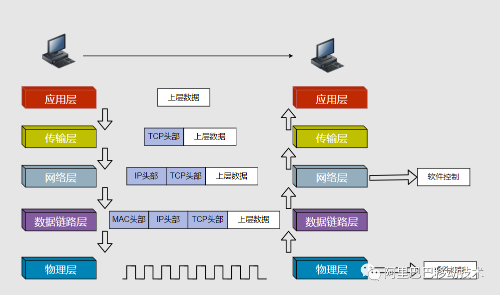 由下图TCP/IP协议传输过程,弱网控制主要有两种场景:硬件控制和软件控制。