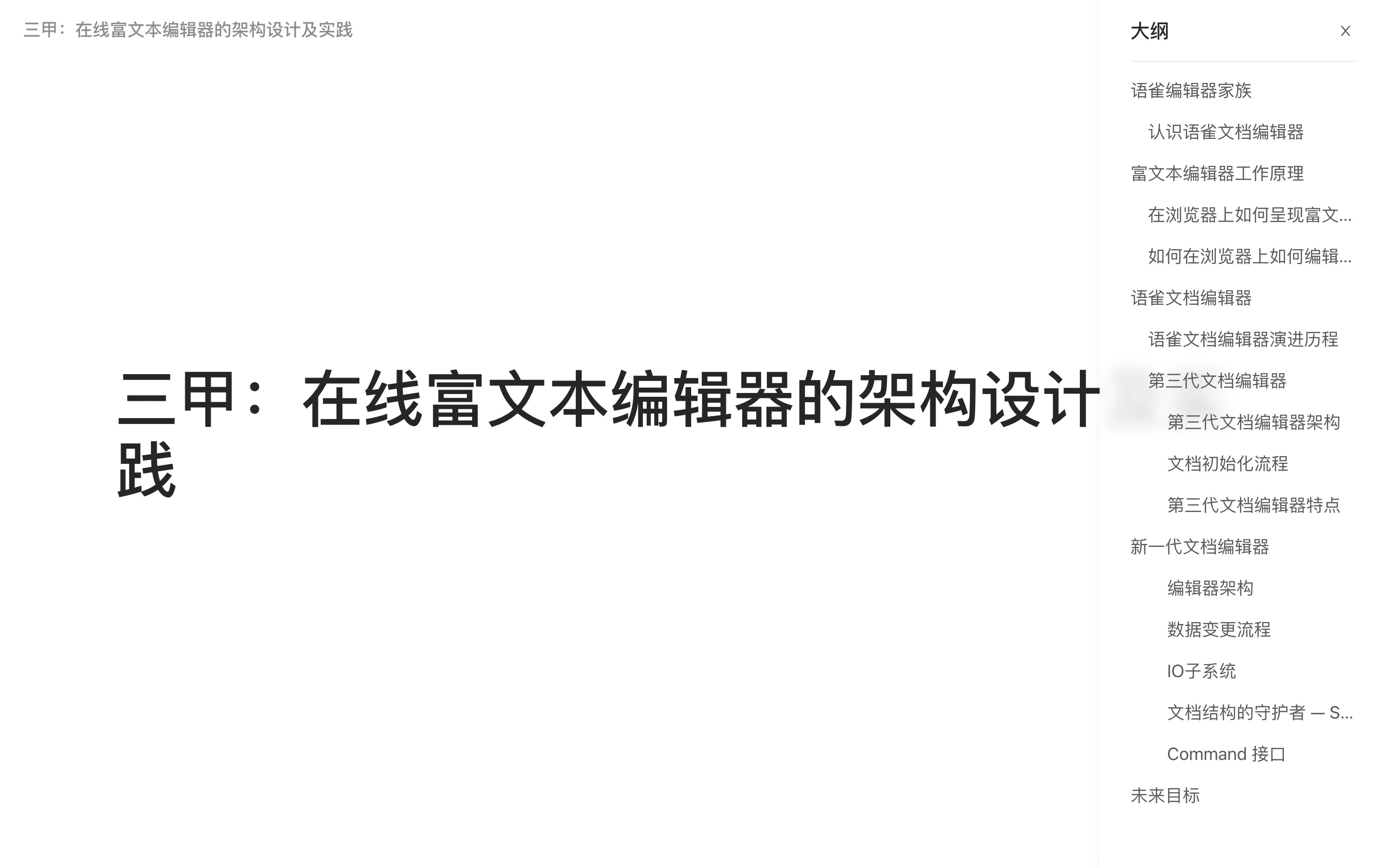语雀的文档演示模式还可以充分利用文档的优势,做到 PPT 难以做到的功能,第一个就是文档的大纲,点击大纲直接跳转到对应内容,再也不需要一页页的去翻 PPT 了: