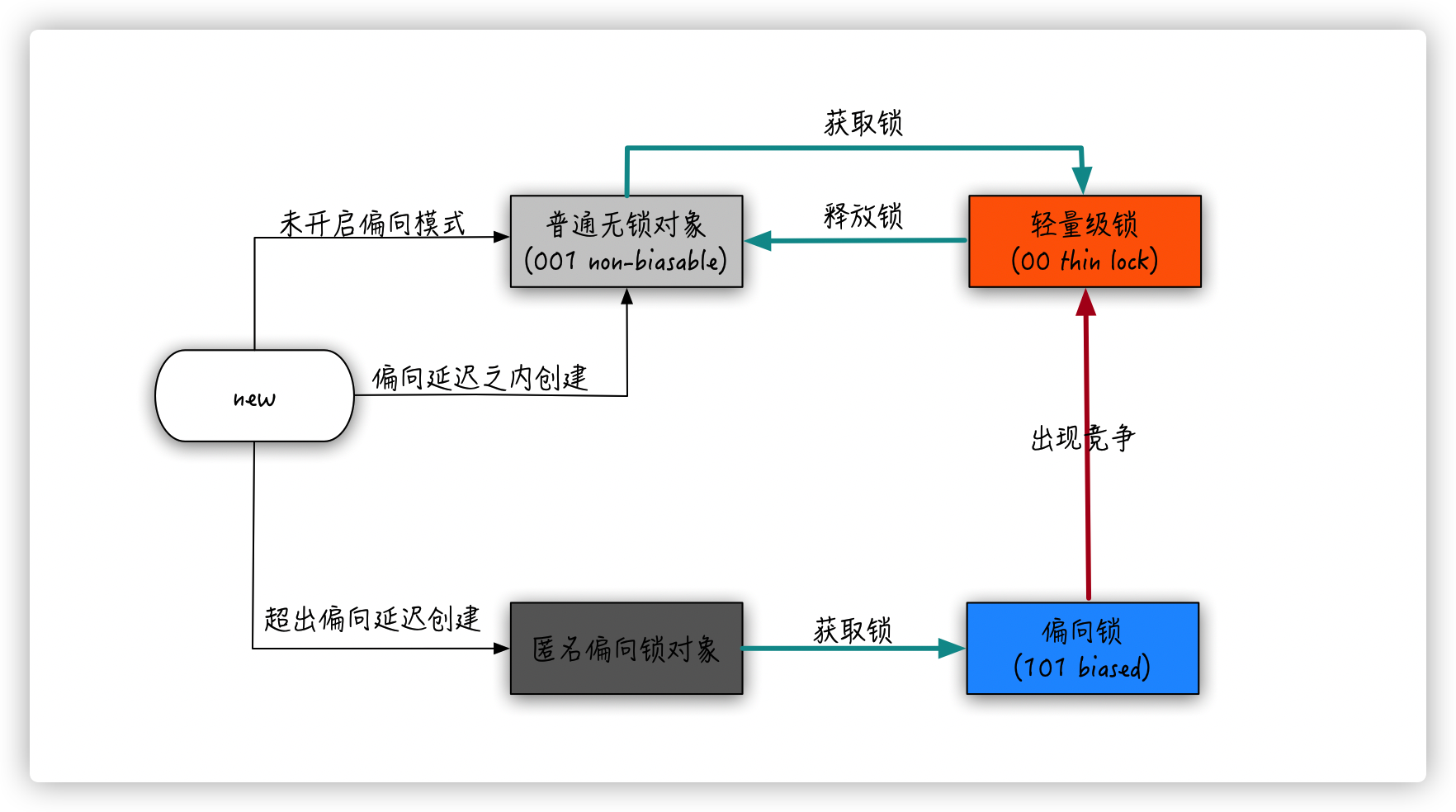 我们可以通过参数 -XX:BiasedLockingStartupDelay=0 将延迟改为0,但是不建议这么做。我们可以通过一张图来理解一下目前的情况: