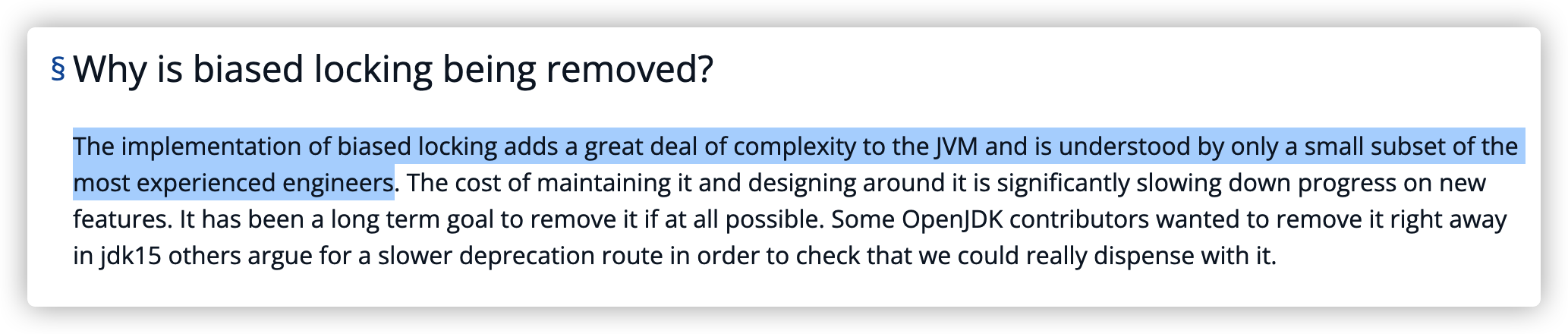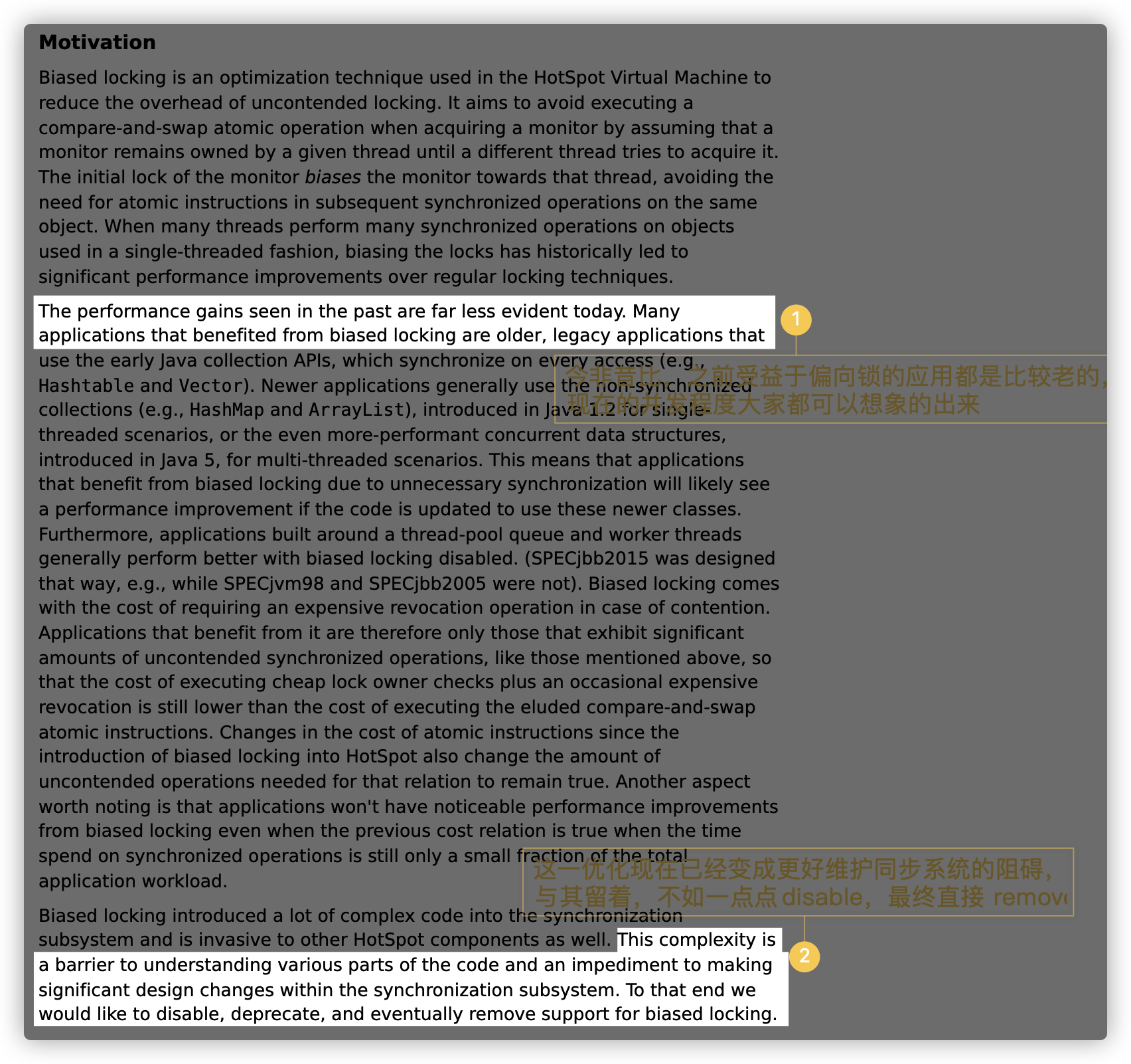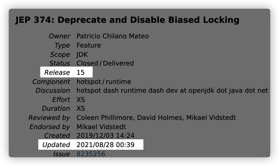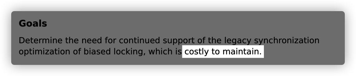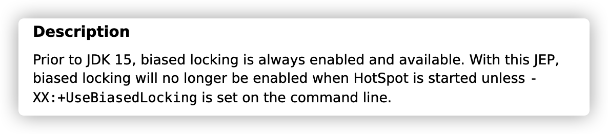 看到这个标题你应该是有些慌,为啥要告别偏向锁,因为维护成本有些高了,来看 Open JDK 官方声明,JEP 374: Deprecate and Disable Biased Locking,相信你看上面的文字说明也深有体会