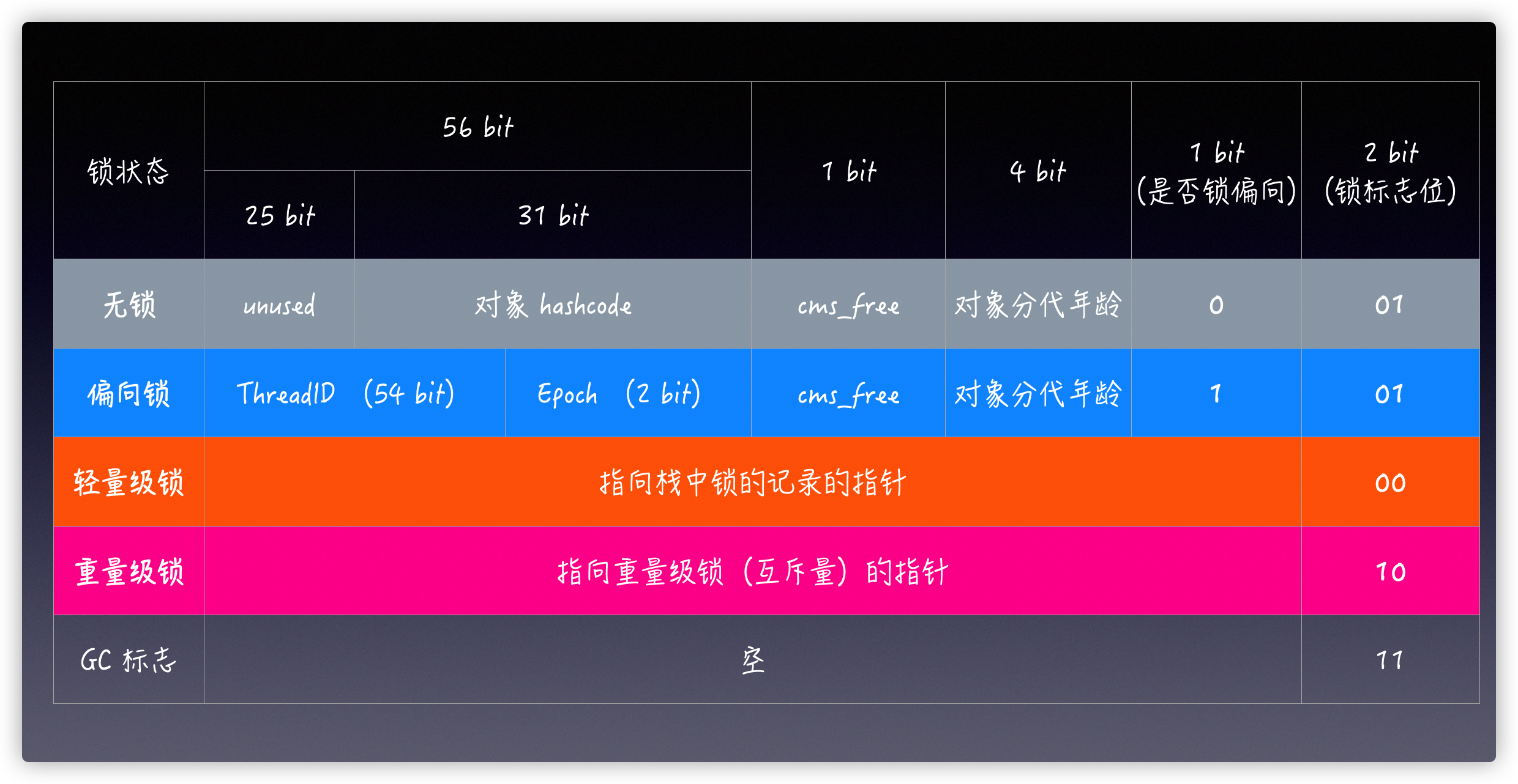 其中 Markword 是保存锁状态的关键,对象锁状态可以从偏向锁升级到轻量级锁,再升级到重量级锁,加上初始的无锁状态,可以理解为有 4 种状态。想在一个对象中表示这么多信息自然就要用位存储,在 64 位操作系统中,是这样存储的(注意颜色标记),想看具体注释的可以看 hotspot(1.8) 源码文件 path/hotspot/src/share/vm/oops/markOop.hpp 第 30 行