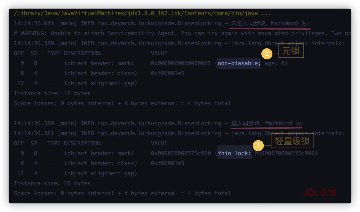 上面我们用到的 JOL 版本为 0.14, 带领大家快速了解一下位具体值,接下来我们就要用 0.16 版本查看输出结果,因为这个版本给了我们更友好的说明,同样的代码,来看输出结果: