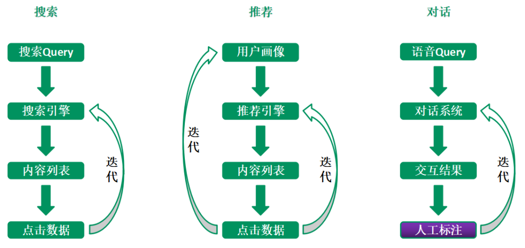 另外,不同于相对成熟的搜索和推荐场景,对话交互能力迭代优化主要依赖人工,难以接上大数据驱动的自反馈自学习高速引擎,难以快速提升。