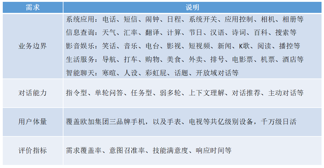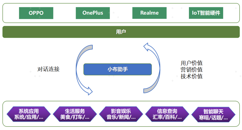 概况来讲,小布助手的使命任务是建立一种对话连接,连接的一端是欧加集团设备生态庞大的用户群,另一端是优质的对话式服务,借助于这种连接来实现用户价值、营销价值,以及技术价值。
