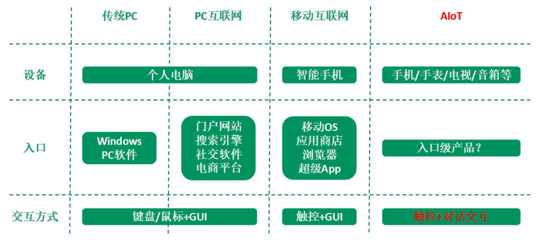 对话交互近年来受到越来越多的关注,其背后的原因究竟是什么呢?其实回顾下近40年来信息科技发展的历程,就不难理解。我们知道,信息科技先后经历了传统PC、PC互联网、移动互联网几个大时代,其中每一个时代都与设备密切相关,进而催生入口和交互方式的革命。而今我们正迈向被寄予厚望的AIoT时代,对话交互因其在新一代搜索引擎、超级服务分发中心、新型交互方式等方面的巨大想象力,恰好承载了这一新时代下一入口级交互变革的使命愿景。