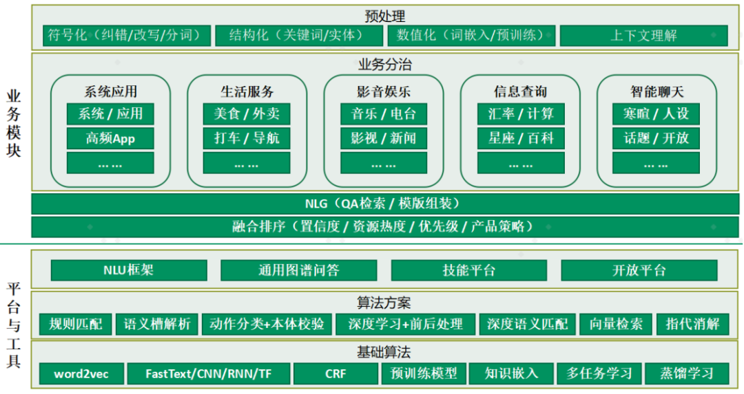 从处理流程上,又可以分为预处理、意图识别、多分类ranking、资源获取和后置处理几个环节,其中前三个节点主要对意图的召准率负责,后两个节点对资源的覆盖度和结果相关性负责,全流程一起为最终的技能执行满意度负责。
