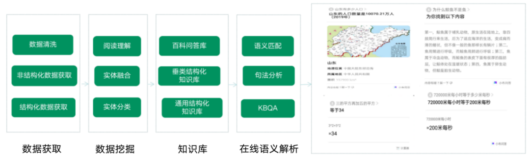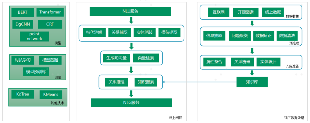 对话系统也被认为是下一代搜索引擎,用户关于知识问答类的诉求也非常多,预期是能够获得精准答案,为了满足这类需求,我们通过数据获取、数据挖掘构建自有知识库,再结合在线语义匹配、KBQA等提供问答服务。