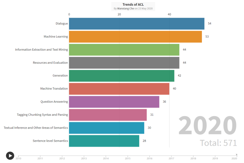 对话交互也是学术界研究的热点,从ACL论文的趋势分析可以看出,近5年来对话交互方向异军突起,在2019和2020年成为当前最热门的研究方向。