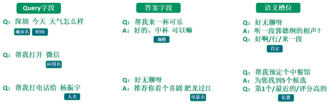 意图识别和槽位提取共同构成语义理解模块,其难点主要在于口语多样化(亿级别独立Query);歧义性(如小猪佩奇是动画片,也是App);依赖知识(如“可不可以”竟然也是一首歌名)。