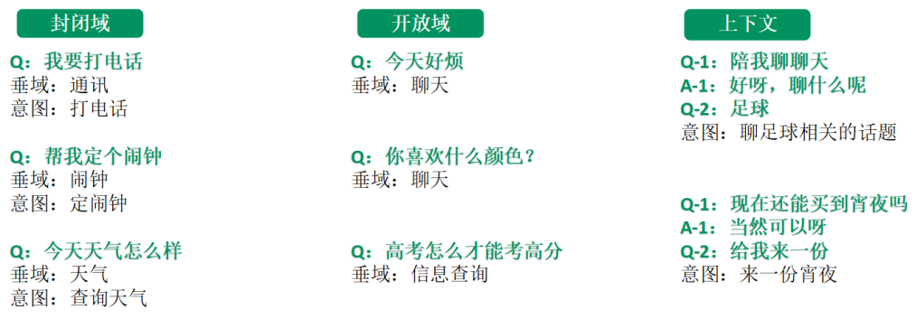 意图识别是语义理解的核心模块,其主要任务是通过对用户当前Query,以及交互历史的分析,推断用户到底想要干什么,包括封闭域、开放域、上下文几种典型的场景。