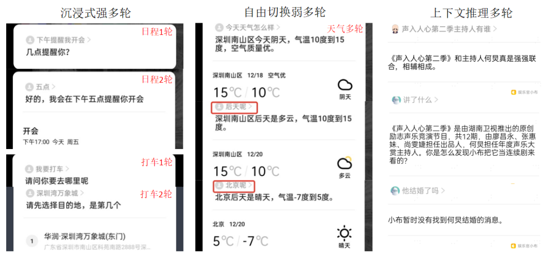 借助于对话管理和上下文理解,小布助手已支持沉浸式强多轮、自由切换弱多轮、上下文推理多轮等模式,覆盖了任务型、信息查询、多轮聊天等业务场景。