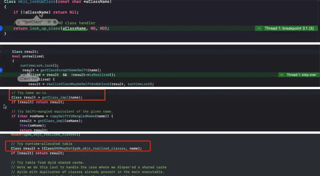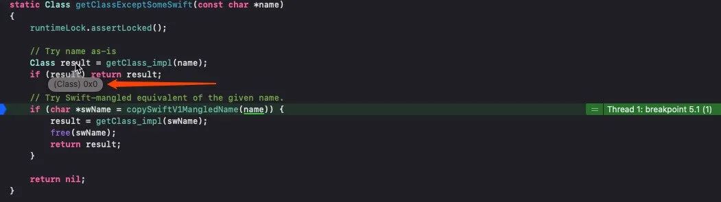 我们跟踪源码的调用流程:objc_lookUpClass -> look_up_class -> getClassExceptSomeSwift