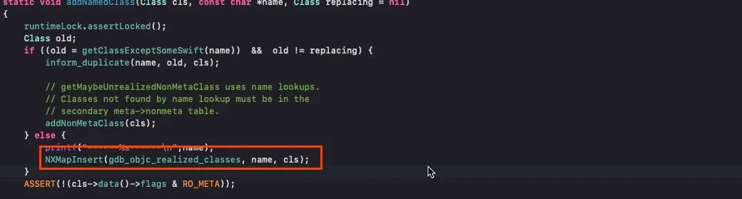 最后我们看到是从 NXMapGet(gdb_objc_realized_classes, name, cls)获取的。gdb_objc_realized_classes保存的是从Mach-O中加载的全部的类,难道是Swift 写的类没有被加载进来?那我们去看看加入的时候是怎么加进去的,我们找到程序启动类插入到gdb_objc_realized_classes 方法