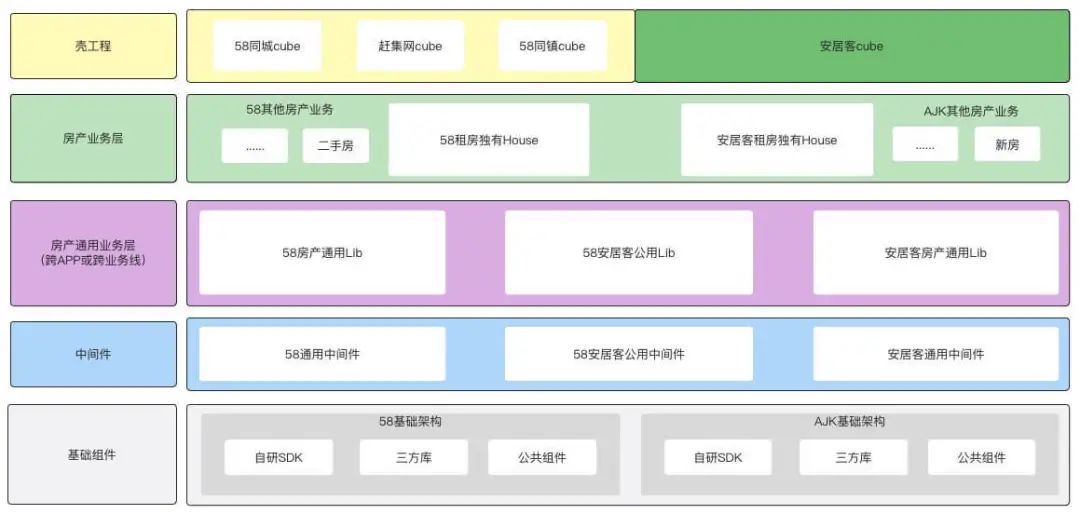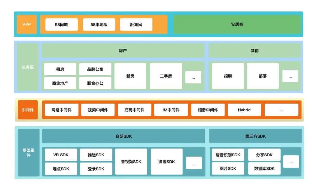 集团在58同城、安居客、赶集网、58同镇都有房产业务,在早期各个团队之间相对独立运行维护。随着业务的垂直化和产业化。房产发起木星计划,目标是打造成一套代码,多APP运行。来降低维护的成本和开发效率。让不同团队更加关注自己的业务,发挥自己的优势。虽然开发维护效率提高了,但同时也增加了工程的复杂度,下面就是房产目前核心业务的业务结构: