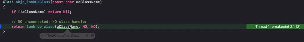 Foundation`NSClassFromString:-> 0x181a3c43c <+0>: pacibsp0x181a3c440 <+4>: stp x28, x27, [sp, #-0x40]!0x181a3c444 <+8>: stp x22, x21, [sp, #0x10]0x181a3c448 <+12>: stp x20, x19, [sp, #0x20]............0x181a3c4f8 <+188>: bl 0x181d41f00 ; symbol stub for: objc_msgSend0x181a3c4fc <+192>: mov x21, x00x181a3c500 <+196>: mov x0, x210x181a3c504 <+200>: bl 0x181d41ef0 ; symbol stub for: objc_lookUpClass