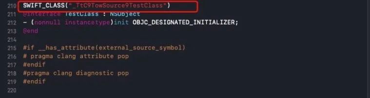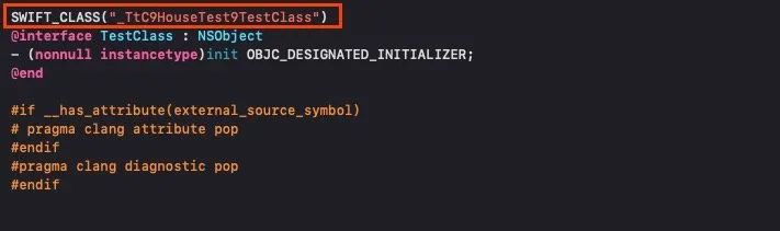 我们在看一下加上 @objc(TestClass)和@objc编译之后的Swift桥接件和没加区别 @objc(TestClass)