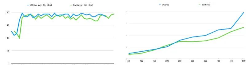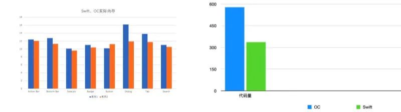 我们测试了下Swift和OC混编情况下的关键性能指标,通过Swift实现的轮播图功能的页面和之前OC之前的轮播图功能页面进行对比。测试方案是加载100次每10次取平均值所得到数据性能指标,得到的结果是:FPS不差上下,CPU性能消耗随着业务量的增加Swift有明显的优势,内存方面Swift比OC占用更高,主要是目前项目工程还是混编环境,Swift需要兼容OC的特性。代码量Swift相比于OC减少38%