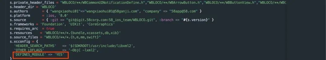 为了Pod库之间能够引用暴露的Swift接口, 第一步需要让被访问的库开启module, 需要在Swift所在的Pod文件夹下的podspec中的xcconfig下,添加’DEFINES_MODULE’ => ‘YES’添加依赖