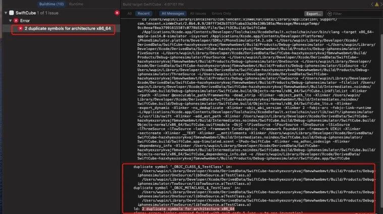 两个Module名不同,类名相同,最后的拼接完之后是不相同的,所以能够正常编译。如果我们给这两个类都加上 @objc(TestClass)呢? 我可以看到编译直接失败。