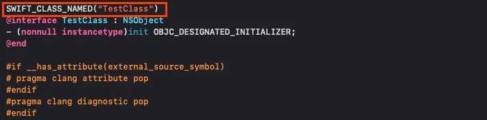 我们最终使用了另外一种方案:在Swift的类中@ojbc后面加上自定义的类名,代码如下: