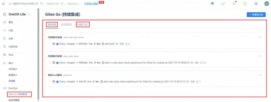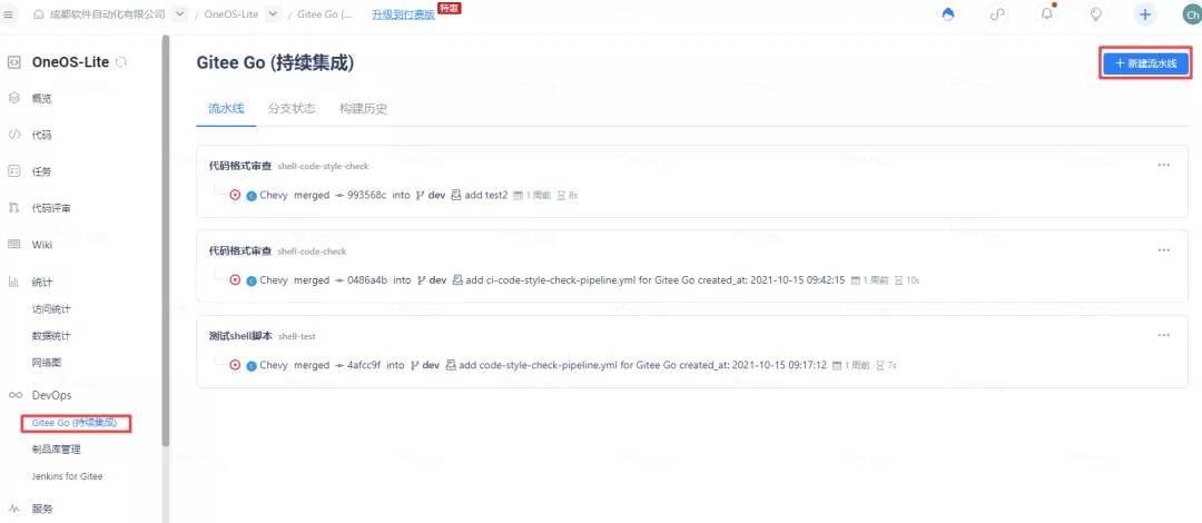 代码仓库 > DevOps > Gitee Go >,可以看到流水线和构建历史。