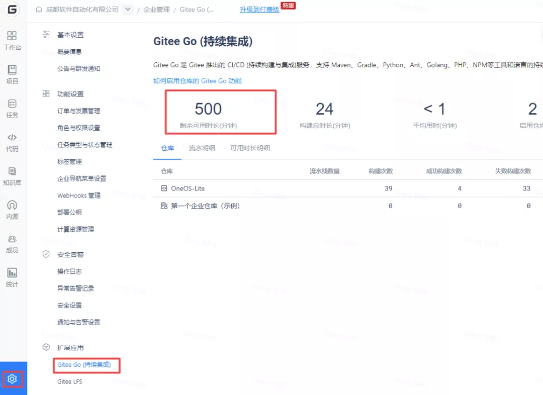 3. 领取免费500分钟构建时长:领取成功后可在 企业管理 > 基本管理设置 > 扩展应用 > Gitee Go 中看到免费赠送的时长,以及已开通Gitee Go服务的代码仓库。