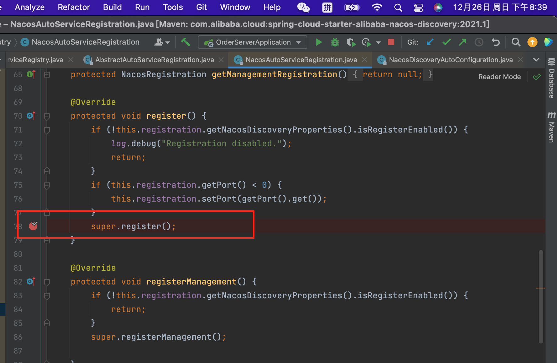 下面进入类NacosAutoServiceRegistration中,如下图,类中有一个register方法,在此处断点: