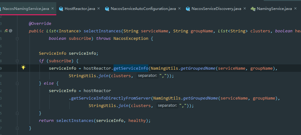其中hostReactor会订阅服务端的实例更新事件,subscribe在这里为true。不为true时是直接从Nacos服务端查询健康的实例,对应的url为/instance/list,这部分代码不做过多解读,只是从内存中根据查询条件查找而已。而getServiceInfo的方法这是直接从本地内存中获取的,虽然同一时刻未必是完全一致的。