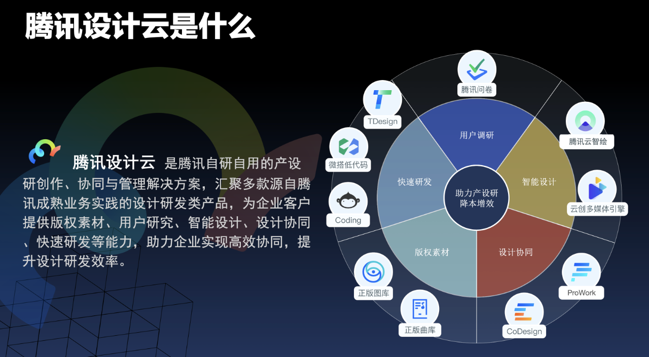 腾讯设计云的产品矩阵包括:运用于调查分析的腾讯问卷、智能化设计生产平台智绘设计、长短视频内容创作与协作平台云创多媒体引擎、一站式设计协作平台 CoDesign、团队协同平台 ProWork、低代码开发平台微搭低代码、软件研发管理协作平台 CODING 、企业级产品设计体系 TDesign 以及正版图库直通车和正版曲库直通车两大版权素材库,为企业客户提供了版权素材、用户研究、智能设计、设计协同、快速研发等能力,并且这些设计能力全部源自腾讯公司内部的 Oteam 团队。
