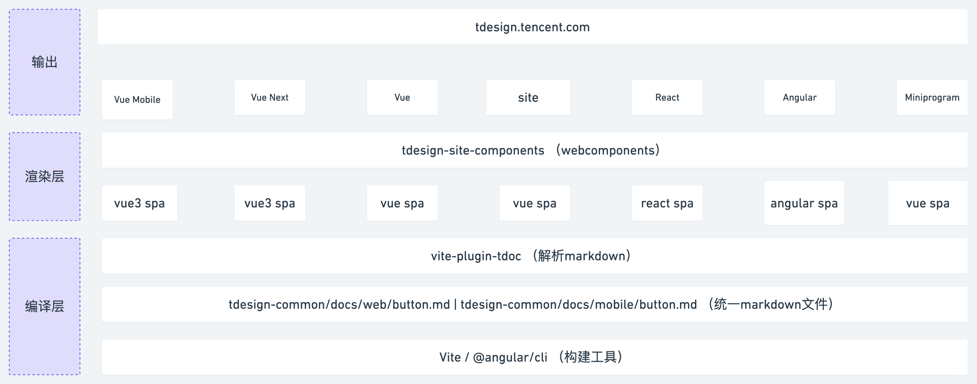 为此,TDesign 团队输出了技术方案,以应对重复写文档的问题。TDesign 输出的架构图主要分为编译层、渲染层以及输出层:其中编译层主要用来解析 Markdown 格式,解决一系列重复的工作;渲染层来处理公共区域,使得不再需要输出组件内的文档;输出层把公共部分剥离出来以后,再把各个框架独立的部分组合起来,最后整体输出 TDesign 的官网站点。